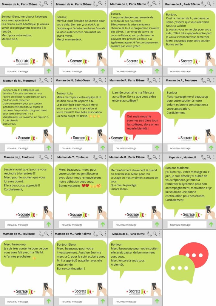 Après qu’élèves et lycéen· nes bénévoles se soient dits au revoir par téléphone, l’équipe de salariées a tenu à remercier l’ensemble des familles des élèves accompagné· es pendant cette année si particulière. Malgré les évènements qui ont marqué l’année scolaire 2019-2020 nos élèves bénéficiaires ont pu être accompagné· es tout au long de l’année (ou presque) grâce au soutien des lycéen· nes bénévoles. Les nombreux échanges téléphoniques avec les familles ont renforcé nos liens : ils nous ont permis d’apprendre à mieux les connaître, d’être à leur écoute et de les conseiller au mieux sur leurs besoins liés à la scolarité de leur(s) enfant(s).