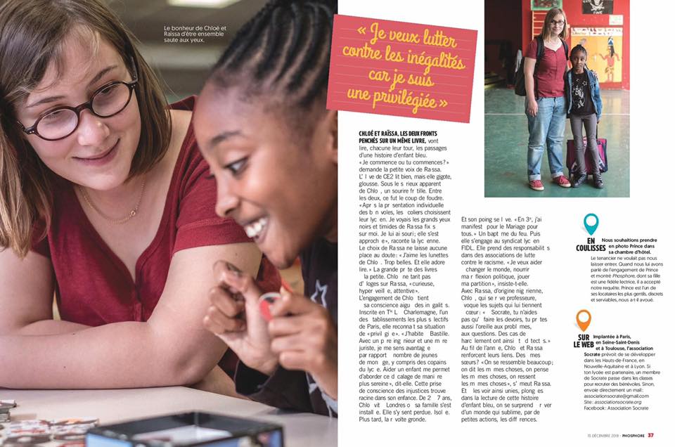 Les binômes de Socrate en sont à l’honneur dans le numéro 456 de Phosphore. Le reportage de Vincent Jarousseau (photographe) et Anne-Laure Lemancel (journaliste) a été réalisé entre avril et mai 2018 dans des ateliers Socrate de Montreuil et de Paris.Nous en sommes très fiers et heureux pour tous les enfants et ados que nous accompagnons, et pour tous les lycéen· nes bénévoles qui s’engagent d’année en année. Un beau cadeau de Noël pour l’association et les Socratien· nes !