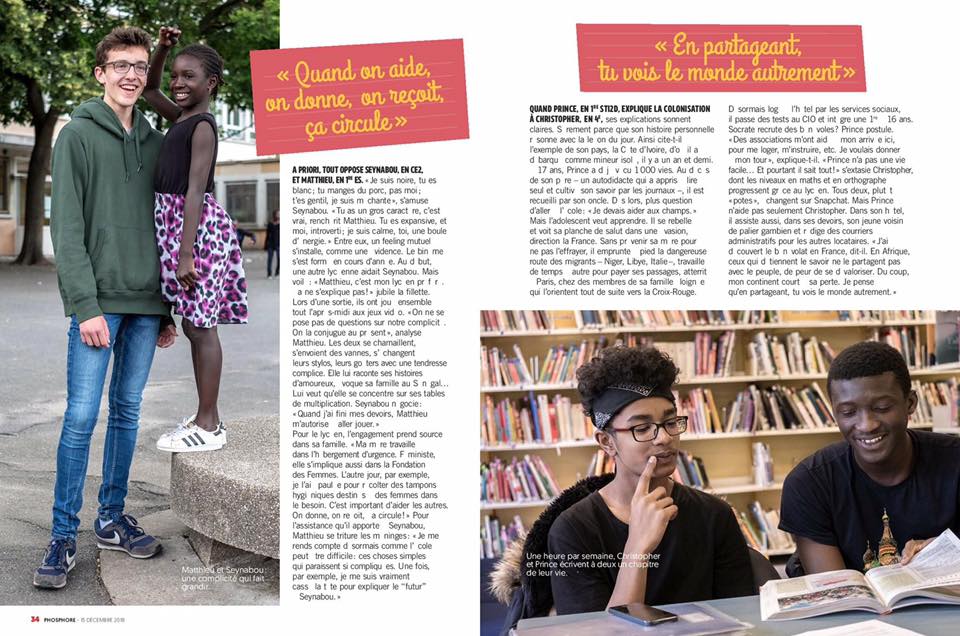 Les binômes de Socrate en sont à l’honneur dans le numéro 456 de Phosphore. Le reportage de Vincent Jarousseau (photographe) et Anne-Laure Lemancel (journaliste) a été réalisé entre avril et mai 2018 dans des ateliers Socrate de Montreuil et de Paris.Nous en sommes très fiers et heureux pour tous les enfants et ados que nous accompagnons, et pour tous les lycéen· nes bénévoles qui s’engagent d’année en année. Un beau cadeau de Noël pour l’association et les Socratien· nes !